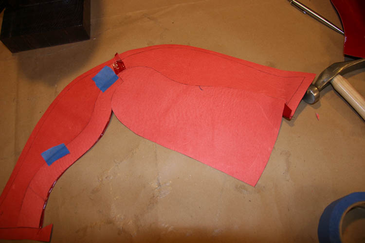 This shape is also contoured to follow the edge of the rear of the hood. Both pieces have enough overlap to make room for the lacing grommets between the edge of the stitching and the rear opening.