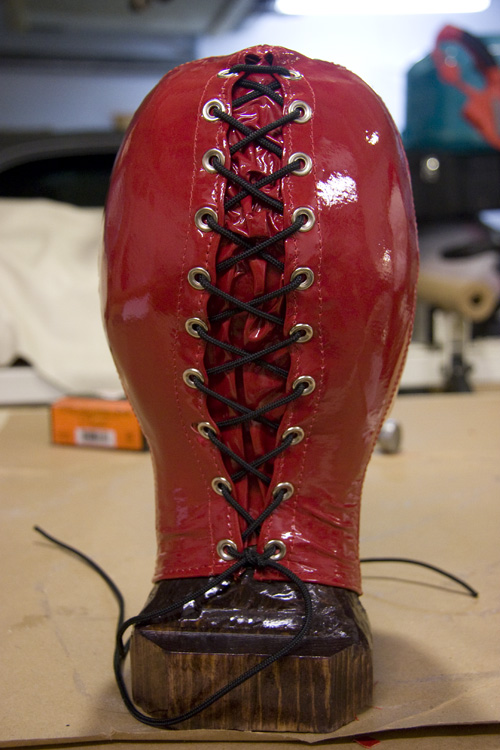 Our 2 hoods are complete! I lace them each on to the hood form overnight, just to break them in a bit, and help them take on the contour of the head.